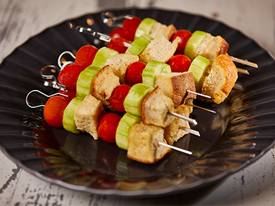 1. Thread 2 tomatoes, 2 cucumber medallions, and 2 bread chunks onto each Skewer, alternating the ingredients until all ten Skewers are full.